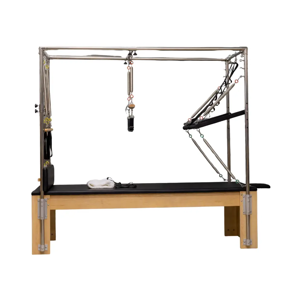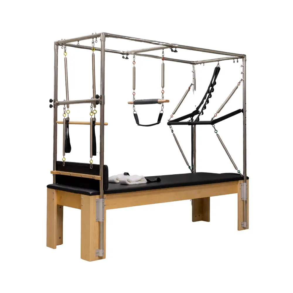 O Cadilac Pilates Bed profissional em madeira é um aparelho versátil e amplamente utilizado em estúdios de Pilates, clínicas e espaços de treino que procuram equipamentos fiáveis e preparados para uso profissional. Permite a realização de uma grande variedade de exercícios focados no controlo corporal, força, mobilidade e estabilidade.